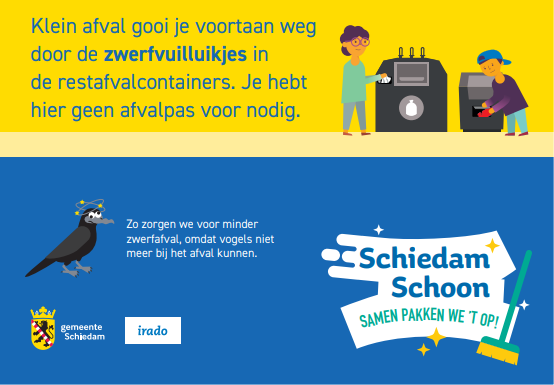 In Schiedam worden de containers voor restafval vervangen voor nieuwe exemplaren, mét zwerfvuilluikje. Dit project loopt langzamerhand op zijn einde. In sommige wijken zijn de containers al vervangen, in andere wijken loopt dit wisselen nog door met een uitloop naar volgend jaar. Door het gebruik van het zwerfafvalklepje worden een aantal afvalbakken in de stad overbodig en zullen deze verwijderd worden.