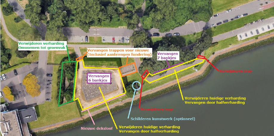 De twee trappen naar het plateau worden vervangen door nieuwe trappen. Ook beschadigd metselwerk bij de trappen wordt hersteld.